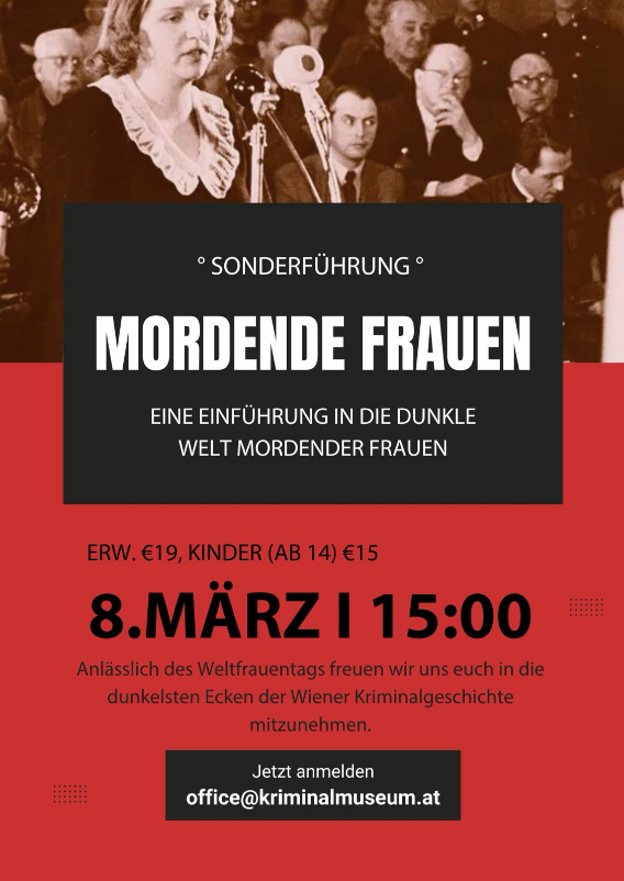 Am 8. März, anlässlich des Internationalen Frauentags, lädt das Wiener Kriminalmuseum aufgrund der großen Nachfrage erneut zu einer besonderen Führung ein: „Mordende Frauen“.